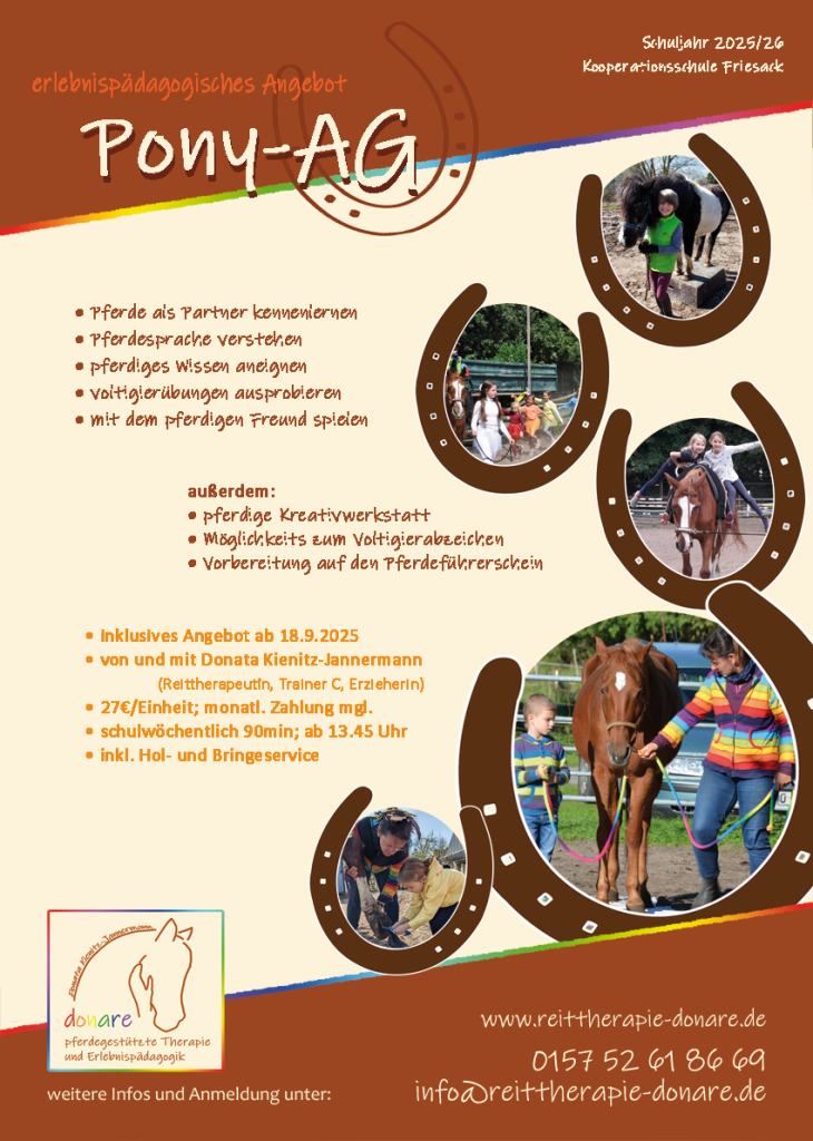 Im Herbst 2024 trafen wir uns zu einem ersten Austausch über mögliche gemeinsame Projekte. Inzwischen ist die Kooperation vertraglich untermauert und der erste Kurs – die Pony-AG – findet regelmäßig statt. Weitere Events – z.B. “Harfenklang und Pferdschnauben” oder der “Sternenguckerritt” sind in Planung.