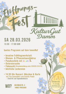 In diesem Jahr findet anschließend die Eröffnungsfeier des KulturGut Damm statt, bei der Du mit Deiner Familie ein Märchen-Konzert genießen und viele andere tolle Sachen machen kannst.